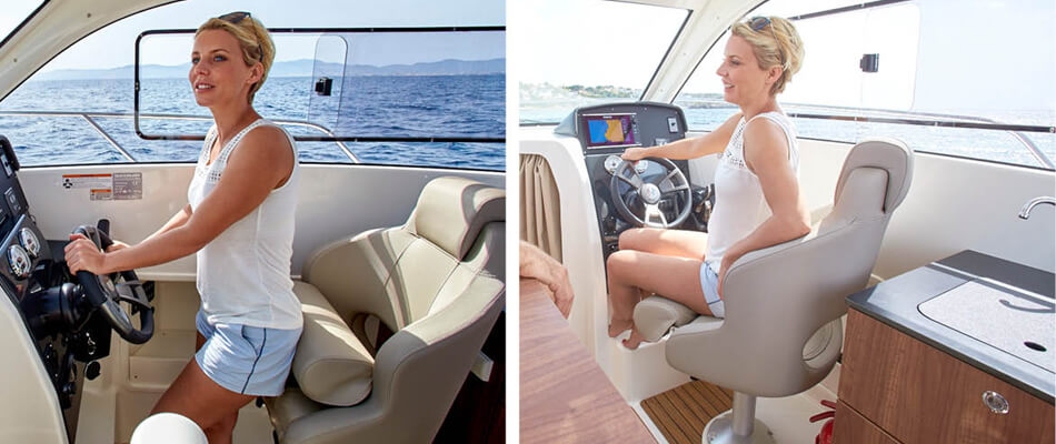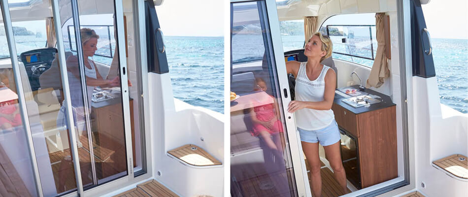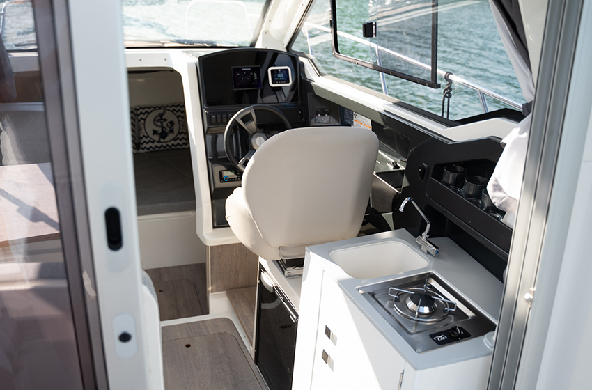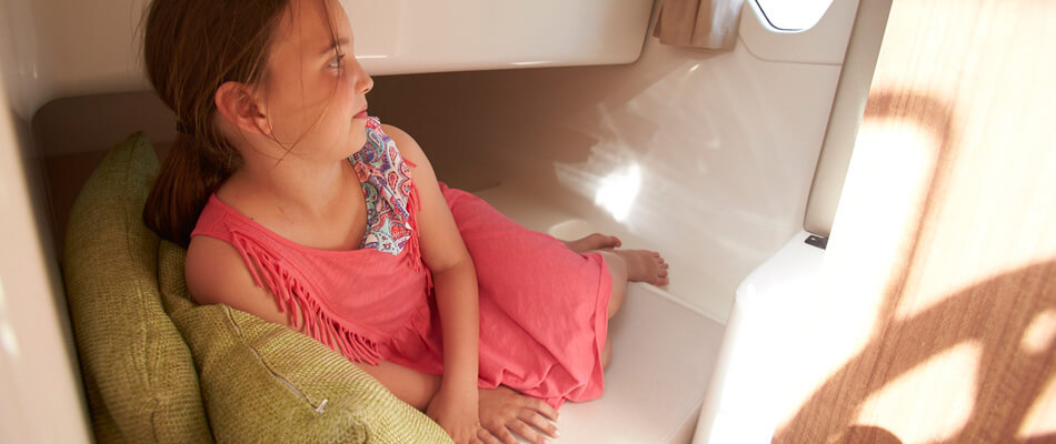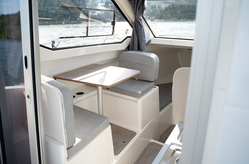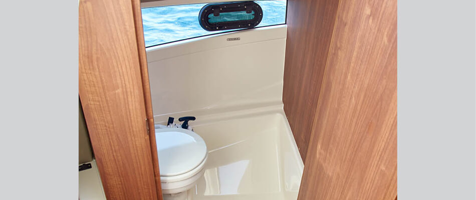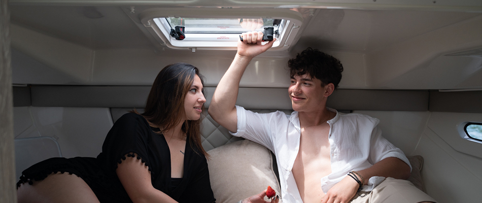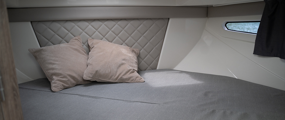 Podczas projektowania Activ 755 Weekend priorytetem były styl, jakość oraz przestronność. Przemyślane zagospodarowanie wnętrza sprawia, że łódź wydaje się znacznie większa, niż jest w rzeczywistości. Elegancko zaprojektowana toaleta morska oraz duże okna dostarczają mnóstwo naturalnego światła zarówno do prywatnej kabiny głównej, jak i rufowej, tworząc jasne i komfortowe wnętrze.
