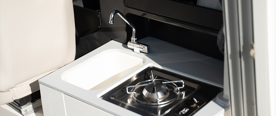 Bez względu na to, czy jesteś w ruchu, czy odpoczywasz na postoju, Activ 755 Weekend jest zawsze gotowy do użytku. W kokpicie znajduje się przesuwane siedzenie z odchylanym oparciem, które można łatwo przekształcić w przestronną jadalnię lub pokład słoneczny. Jeśli chcesz więcej słońca, na dziobie czeka dodatkowa leżanka. Opcjonalna klimatyzacja i ogrzewanie pozwolą utrzymać idealną temperaturę. Duża kuchnia wyposażona w kuchenkę i lodówkę umożliwi Ci przygotowanie doskonałego obiadu na wodzie.