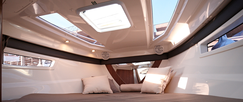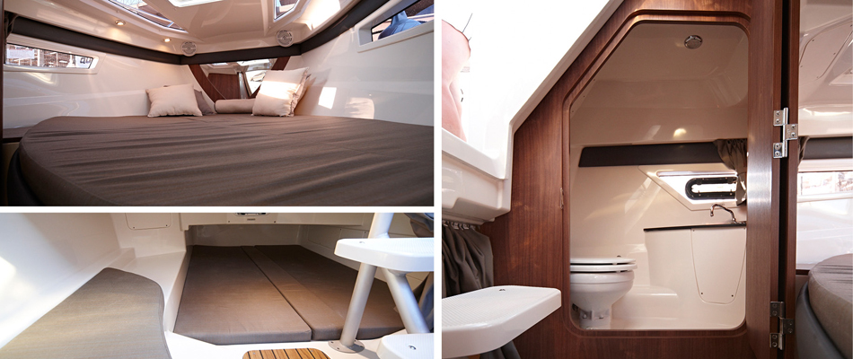 Activ 805 Cruiser zapewnia przestronną i dobrze wentylowaną kabinę dziobową z podwójnym łóżkiem oraz prywatną łazienkę wyposażoną w okno, umywalkę i toaletę. Praktyczna kuchnia oferuje lodówkę, system świeżej wody i kuchenkę, umożliwiając wygodne przygotowywanie posiłków na wodzie. W ciągu dnia łódź może komfortowo pomieścić do dziewięciu dorosłych osób, zapewniając im stylowe i wygodne warunki.